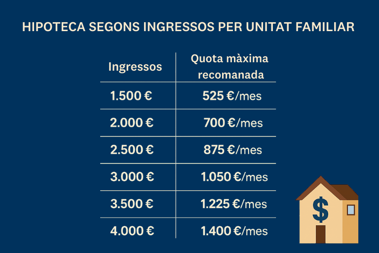 La majoria de bancs recomanen que la quota mensual de la teva hipoteca no superi el 35% dels teus ingressos nets. Aquest límit t'ajuda a saber quant pots demanar hipoteca segons el teu sou, mantenint unes condicions de pagament còmodes i sostenibles.