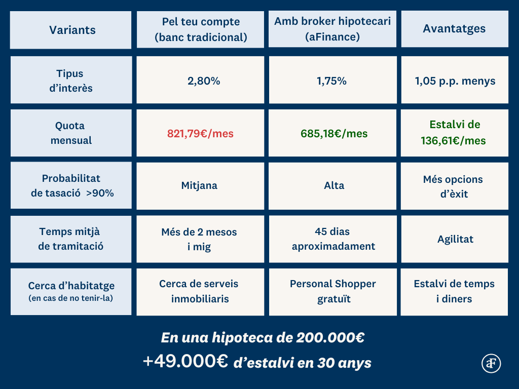 A aFinance estudiem la teva situació econòmica de forma personalitzada, comparant entre desenes d'hipoteques de diferents bancs, negociant per tu per tal d'obtenir el tipus d'interès més baix i el finançament més favorable. A més, us acompanyem durant tot el procés hipotecari, garantint que la vostra experiència sigui segura i transparent.