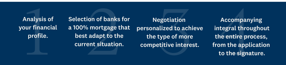 Banks that offer 100% mortgages do exist, but the key is knowing how and with whom to negotiate. At aFinance, we have experience managing complex mortgages and negotiating preferential terms. Thanks to our transaction volume and exclusive agreements with banks, we can help you obtain a mortgage with no down payment and more competitive terms.